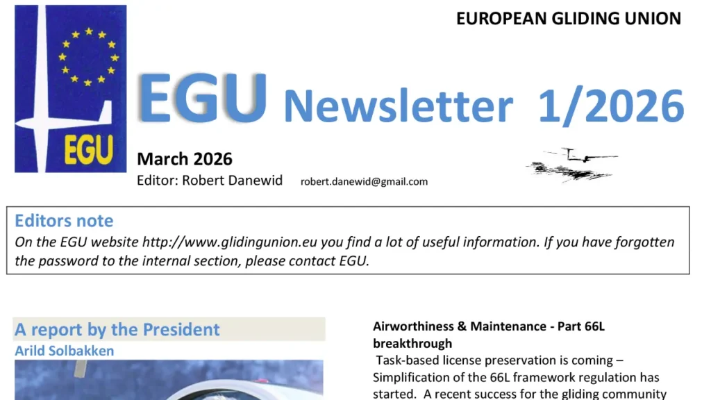 The EGU is the association of European Gliding Federations or Gliding Sections of National Aero Clubs. Its aim is to represent the interests of all glider pilots in Europe with respect to regulatory affairs.